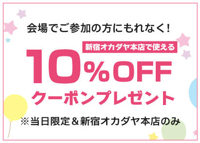 会場でのお食事不可。ドリンクはOKですが、フタのあるボトルなどでお持ち込みください。